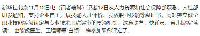 这意味着,快递员、育儿嫂等“蓝领”,也能像医生、工程师等“白领”一样参加职称评定了。