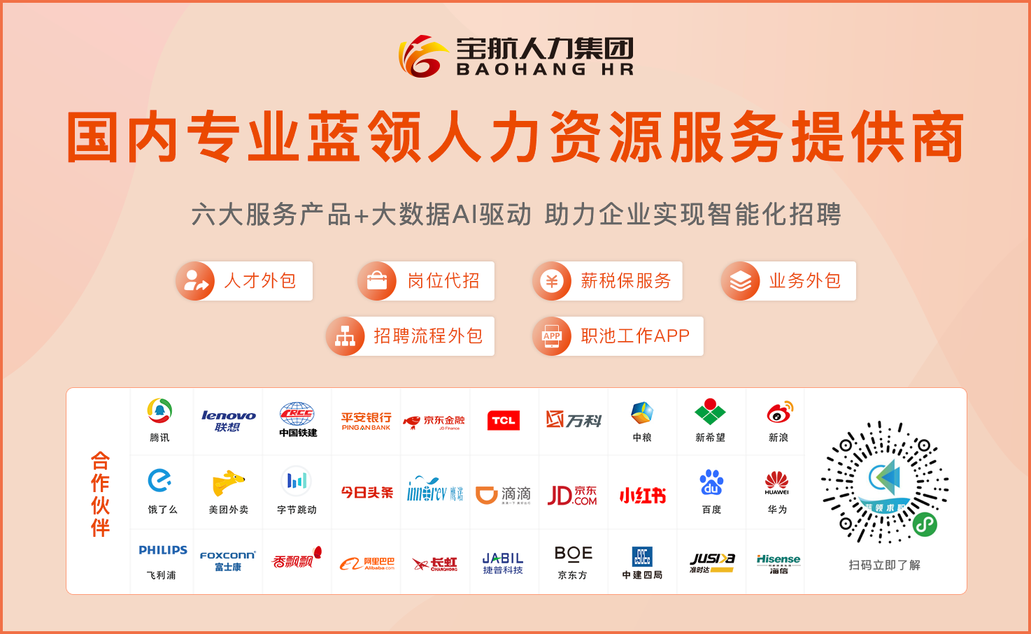 目前宝航人力集团合作企业800余家,每年为企业输出超5万劳务人员,累计解决蓝领就业人群超50万人次。涉及一线普工、操作工、质检、专业技工、客服服务等多个岗位领域,合作企业涵括制造业、互联网/金融、电子科技、食品、医药等多个行业。切实做到了为企业降低成本,增加效益,为求职者减轻求职压力,增加找工作效率。立足蓝领行业10余年,赢得企业及求职者一致好评。